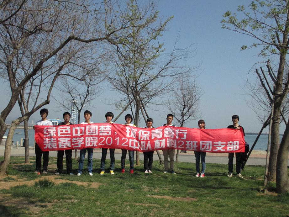 为更好的学习、宣传贯彻党的十八大精神,引导班里团员青年深刻领会习近平总书记对“中国梦”的阐述,并结合社会存在的相关不环保的现状,材料2班团支部于5月18日在星海公园进行了“绿色中国梦,环保青春行”的活动。