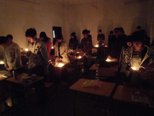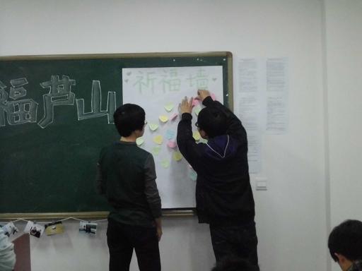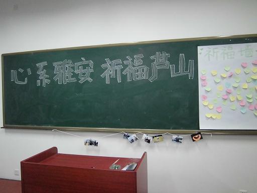 黑暗中一个个烛光,犹如一个个希望,根植于心中。整个活动中,教室里的气氛都十分严肃庄重,同学们手捧蜡烛,在主持人孙昱声的宣布后开始集体默哀一分钟。默哀毕,团支书鼓励大家在便利贴上写下自己对雅安同胞的祝福,在祈福墙上留下自己的祝愿。同学们想着灾区的人们,怀着沉重的心情参与了此次的祈福活动。