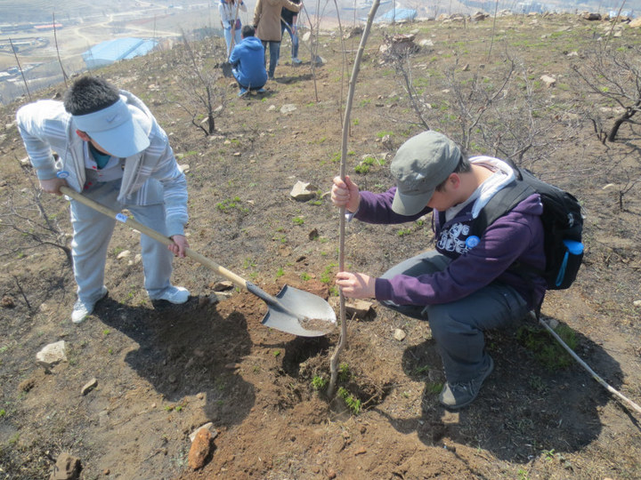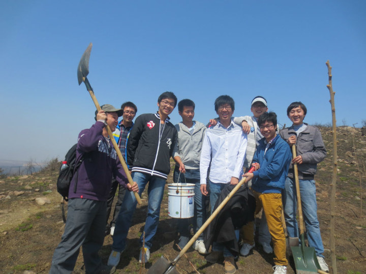 4月21日,全班同学在西山体育场集合,乘车一同前往郊区的一座山头,进行植树活动。曾胜伟同学联系了大连高校环境联盟,为本次活动提供了树苗和工具。到达植树地点,大家分成了3人小组,每组成员分工明确,打水、刨土、植树、填土、浇水……同学们从山下一桶一桶地往山上提水,毫无倦意,大家为能够绿化环境而乐此不疲。活动当天班级同学共种植了20棵树苗。植树活动后部分同学合影留念。最后,大家集合点名,一起坐车回校。