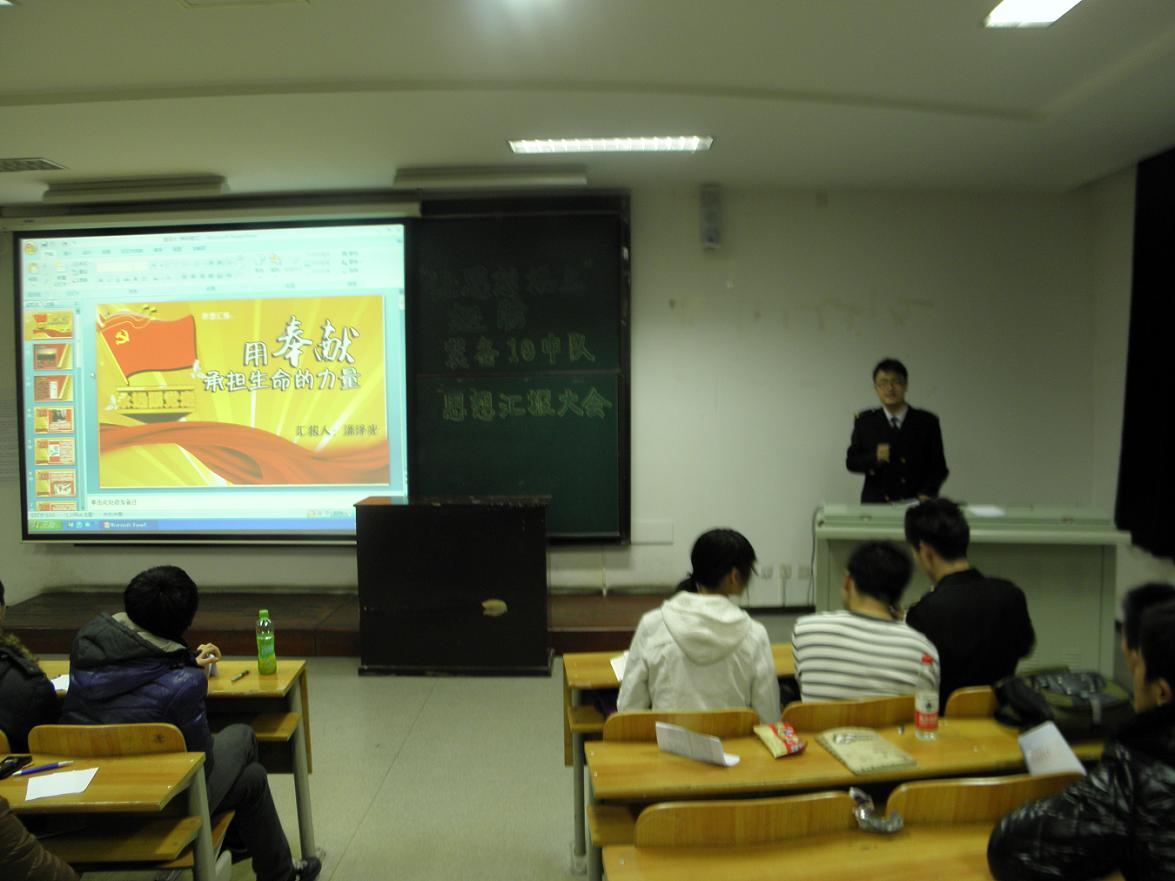 此次双学会在远航楼204召开,参会的有10中队指导员、指导员助理以及中队各班的同学们。会议包括两个内容:红色思想汇报以及蓝色学习思想交流。会场上同学们以各种各样的形式;丰富多彩的内容;独特新颖的形式向同学们展示了大学一年来我们的思想成果。同学们精彩的红色思想讲演让参会的同学们赞不绝口,掌声响彻整个会场;优秀学生代表的蓝色学习经验交流更是给同学们带来了一场绝对震撼的视听盛宴。