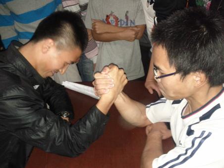 比赛场面火爆,气氛激烈。一桌立于走廊中,两人对坐,双目对视,两手相握。力量对决之时迸溅出令人目眩的火花,两强相争,征于色发于声,得之心而胜负不可绝矣!本次比赛不仅有船舶二班同学参加,还有船舶一班同学们热情的加盟,这使得比赛在娱乐中增添了些许竞争的味道,而指导员的的意外出手更是将比赛推向了巅峰。