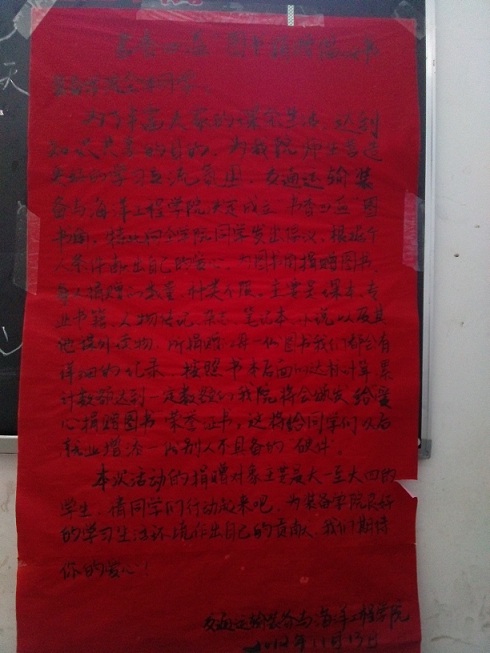首先,由装备2012中队组织编写了《“书香四溢”图书角图书捐赠倡议书》,并将其张贴在十三舍、A2、A5、A7等宿舍楼,积极宣传,号召森林舞会老虎机